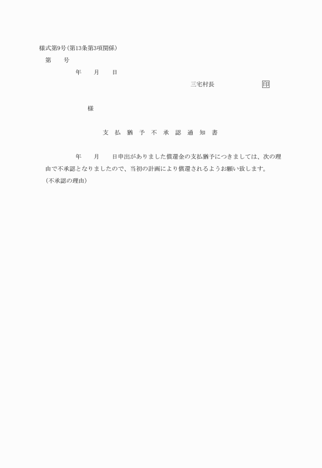 3 村長は、支払の猶予を認めない旨の決定をしたときは支払猶予不承認通知書(様式第9号)を当該借受人に交付するものとする。