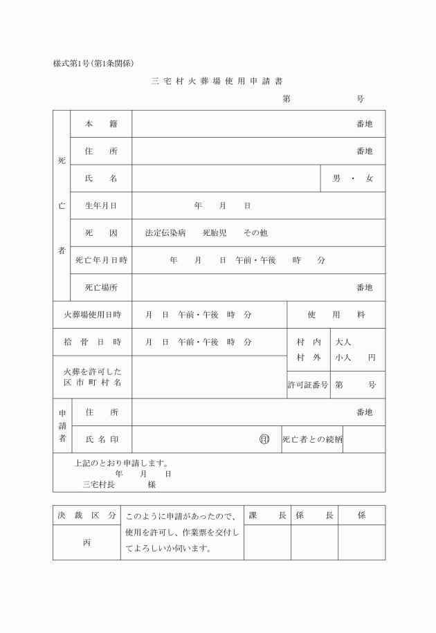 第1条 三宅村火葬場条例(平成4年三宅村条例第13号。以下「条例」という。)第3条の規定により火葬場を使用しようとする者は、様式第1号の火葬場使用申請書に埋火葬許可証又は改葬許可証を添えて村長に提出しなければならない。
