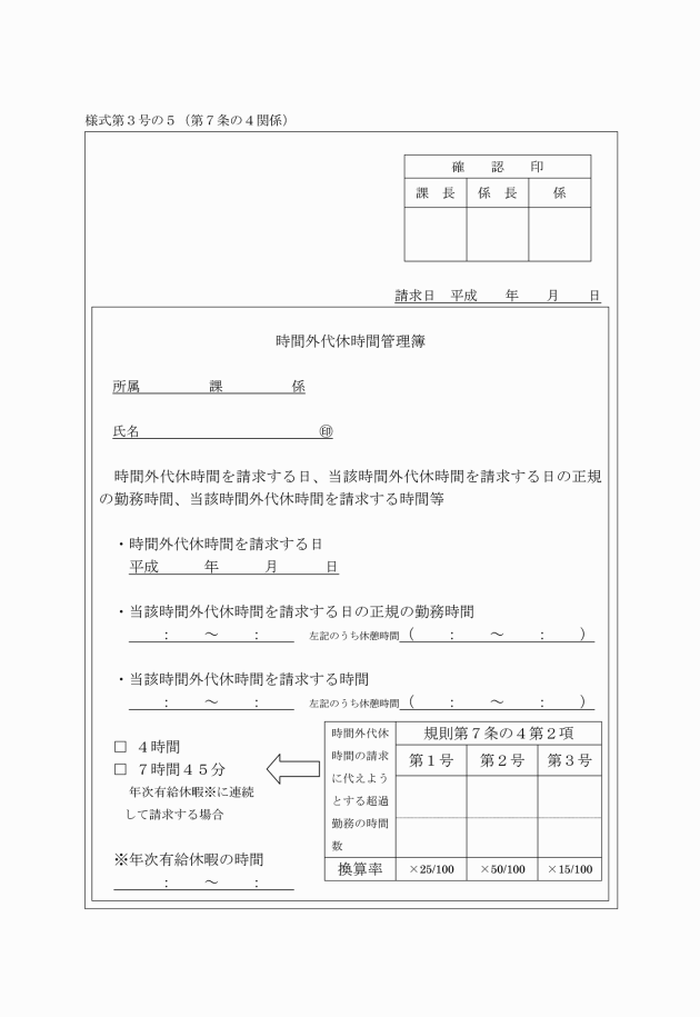 4 条例第9条の5の規定による時間外代休時間を請求するときは、様式第3号の5により行うものとする。