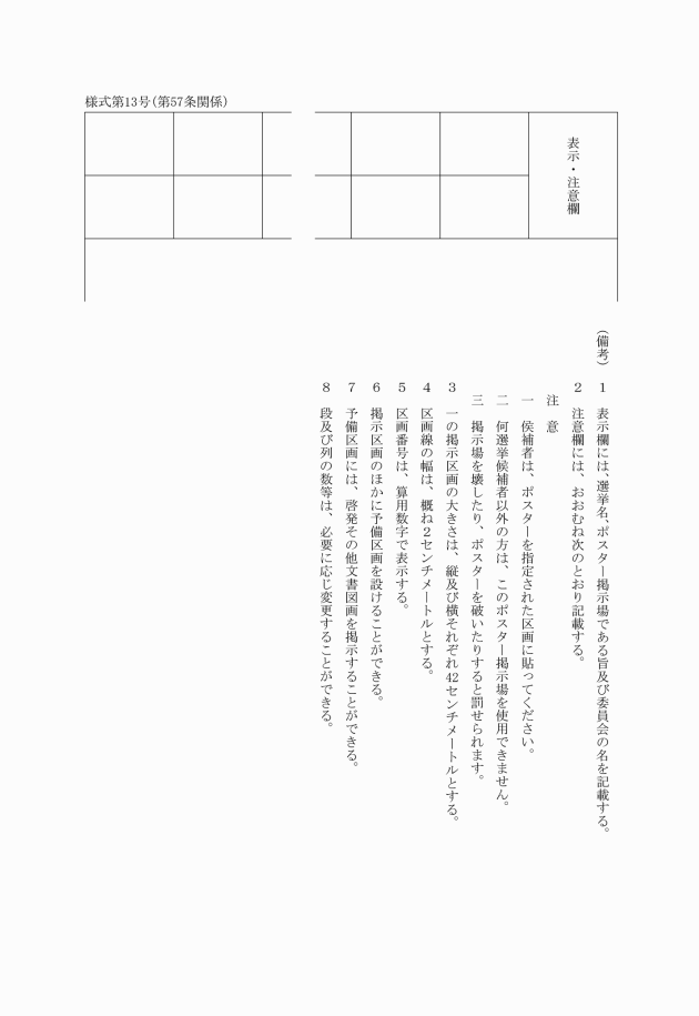 第82条 法第201条の11(政治活動の態様)第11項及び法第201条の14(選挙運動の期間前に掲示されたポスターの撤去)第2項の規定により委員会が文書により違反文書図画を撤去させるときは、様式第26号に準ずる撤去命令書によるものとする。