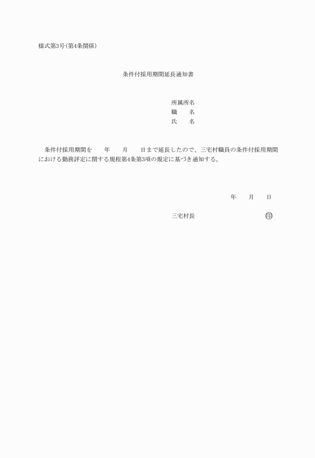 2 前項の条件付採用期間の終了前に任命権者が別段の措置をしない限り、三宅村職員の条件付任用の期間及びその期間の延長に関する規則(平成19年三宅村規則第1号。以下「規則」という。)第2条の規定に基づき採用は正式のものとなる。