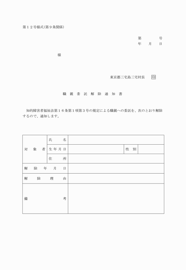 第6条 職親への委託を希望する知的障害者又はその保護者は、知的障害者職親委託措置申請書(第8号様式)により、村長に申請しなければならない。