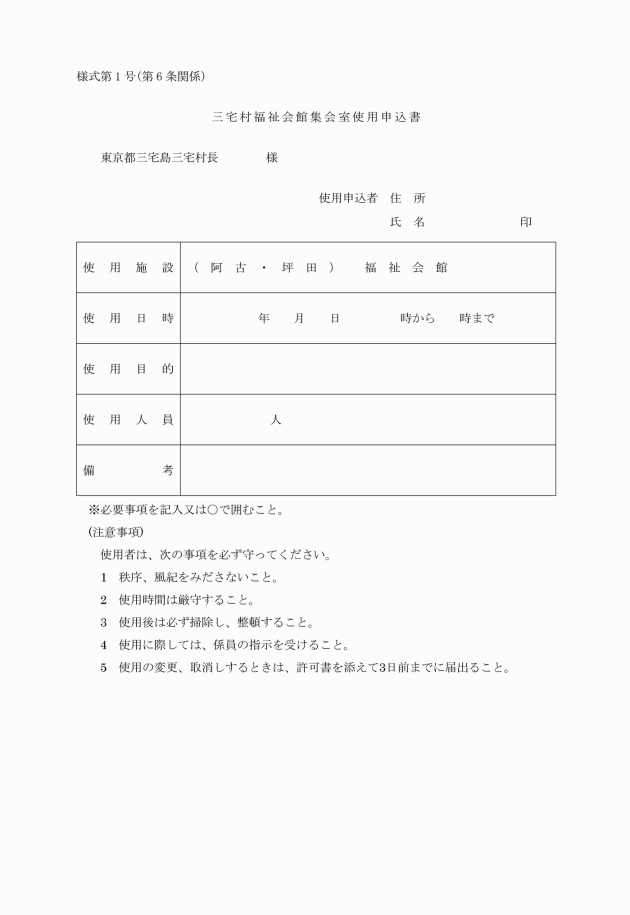 第9条 集会室の使用を取り消す者は、三宅村福祉会館集会室使用取消届(様式第4号)を村長に届出なければならない。