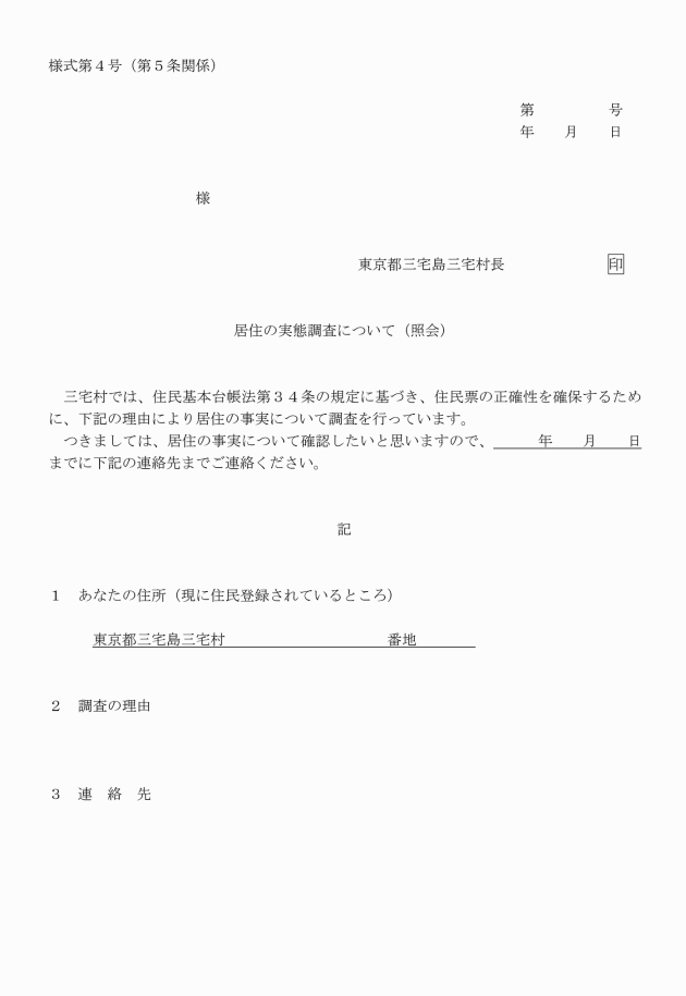 第1条 この要綱は、村長が住民基本台帳法(昭和42年法律第81号。以下「法」という。)第8条及び住民基本台帳法施行令(昭和42年政令第292号。以下「政令」という。)第12条の規定に基づき、三宅村の住所地に実際には居住していない者(以下、「不現住者」という。)の住民票を職権で削除すること(以下、「職権削除」という。)に関して必要な事項を定めることを目的とする。
